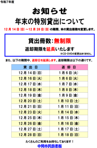 なお、12月14日(日)~12月28日(日)までは、特別貸出しとして